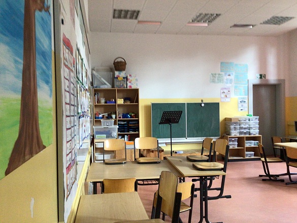 Meistens gibt es einen Bänkekreis, viele Tische, Schränke, Stühle, ein Whiteboard und Arbeitsmaterialien.